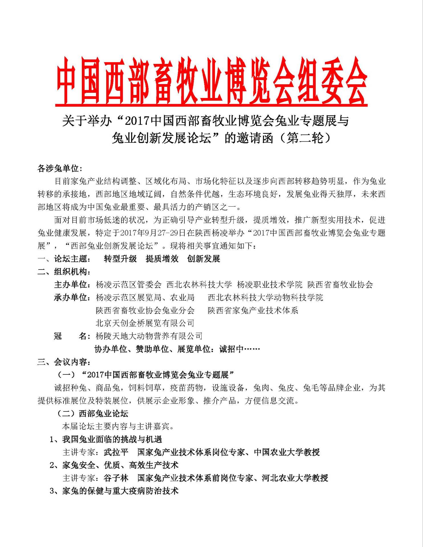 关于举办“2017中国西部畜牧业博览会兔业专题展与兔业创新发展论坛”的邀请函(第二轮)