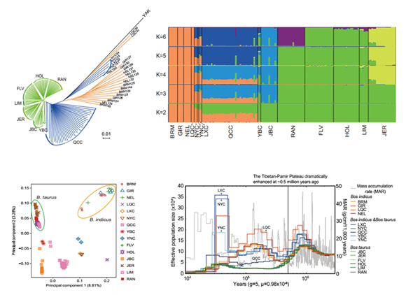 我国是世界上牛品种最多的国家之一,地方黄牛品种多达52个,这些地方品种由于生存在不同的自然环境中,受生态多样性和长期人工驯化的影响,形成了家养牛中极为丰富的遗传多样性和各具特色的优异种质特性和经济性状,遗传资源丰富,具有极其重要的研究价值,然而,国内仍缺乏从全基因组水平针对我国黄牛品种开展进化和生物学研究。昝林森教授团队对分布在中国不同地区的秦川牛、南阳牛、鲁西牛、延边牛、云南黄牛、雷琼牛等 6 个主要黄牛品种以及安格斯牛、黑毛和牛2个引进的专门化肉牛品种共8个品种进行了全基因重测序,并结合国外现有7个牛品种的测序数据,开展了中国黄牛群体历史和适应性研究,构建了中国黄牛全基因组遗传变异数据库。该研究共检测到了 5722万个SNP和 527万个InDel,通过与牛的现有遗传变异数据库(dbSNP140)比对,结果显示超过一半的 SNP(59.90%)和InDel(72.45%) 为最新发现,从而极大地丰富了世界上牛的遗传变异数据库,印证了中国黄牛具有丰富的遗传多样性这一特征,同时也说明了中国黄牛具有极其重要的潜在价值。该研究还表明了大部分中国黄牛在进化过程中经历了两次群体扩张和两次次瓶颈效应,而且在品种形成中受到普通牛和瘤牛两种血统的影响。此外,通过全基因组选择分析,挖掘了一些与产肉、产奶、毛色、抗逆等重要性状相关的重要区域和功能基因。