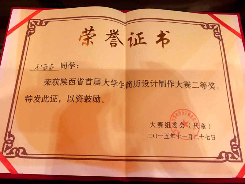 陕西省首届大学生简历设计制作大赛由陕西省教育厅、陕西省高等学校毕业生就业服务中心等单位联合举办,大赛自10月中旬开始,历时一个多月,共有来自全省59所高校的1751名毕业生参加比赛,经过初赛、复赛、网上决赛等环节,最终来自13所高校的15名选手进入现场总决赛环节,总决赛选手通过现场展示VCR,陈述自己简历,最后由评委和用人单位进行提问,并现场点评和打分,评出奖项。本次大赛中成人网址 获得最佳组织单位奖,孙菲菲简历指导教师白金凤老师获得优秀指导教师奖。