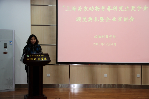 学院党委副书记王晓娟宣读关于对2015-2016学年度“上海美农动物营养研究生奖学金”获得者的表彰决定,各位嘉宾为闫娜娜等6位获奖学生颁发荣誉证书。王晓娟副书记代表学院对上海美农生物科技股份有限公司表示衷心的感谢,希望企业与学院进一步加强联系,营造校企合作、共同育人的良好氛围。同时,勉励获奖学生在今后的工作、学习和生活中发挥先锋模范作用,努力工作、刻苦学习,不断积累经验,努力提升自己,以优异的成绩感恩企业、回报社会。