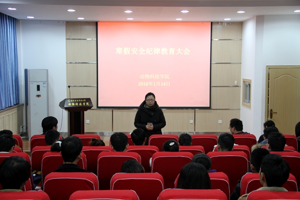 2016寒假即将来临,学院特召开寒假安全纪律教育大会。学院党委副书记王晓娟针对假期安全纪律,建议各班班长、支书可以利用班级QQ群、微信群保持同学联系,了解学生动态,及时反馈;强调了寒假期间严禁集体外出旅游,寒假留校同学应保持与家长、辅导员联系,定期汇报在校情况,同学们应提高安全意识和安全防范能力,确保人身和财产安全,严防误入非法传销组织。同时,学院加强家长俱乐部互动交流,与学生家长保持联系,合力保证学生假期安全。