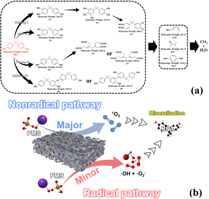图2 BPA在NPB-2/PMS体系中的主要降解途径和机制