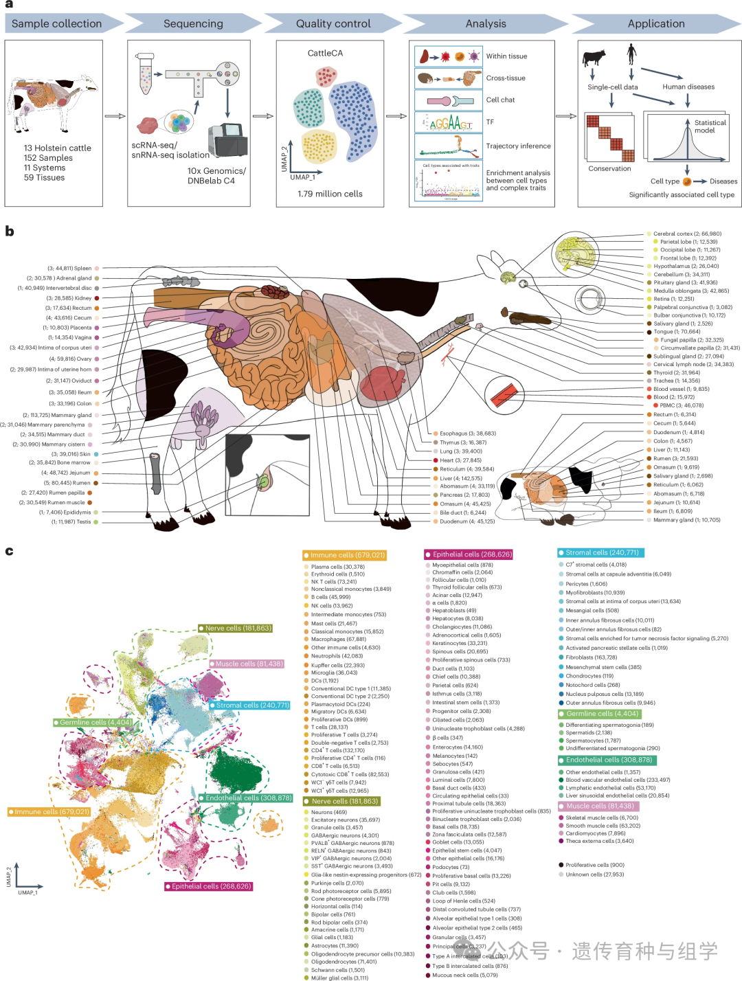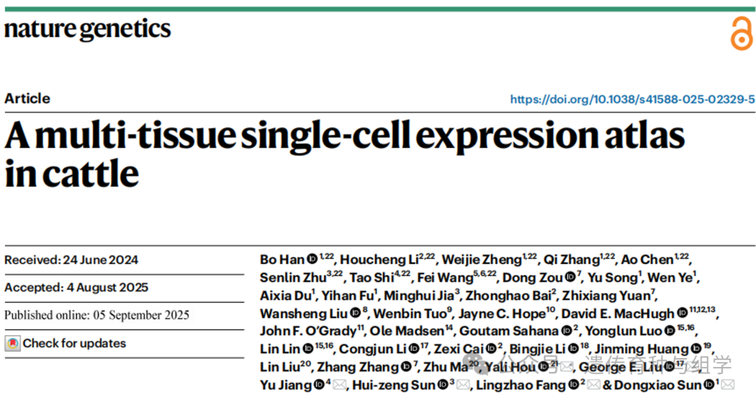 2025年9月5日,中国农业大学动物科学技术学院孙东晓教授团队联合丹麦奥胡斯大学房灵昭博士、浙江大学孙会增研究员、成人网址 姜雨教授等合作团队在国际知名期刊《 Nature Genetics 》上在线发表题为“A multi-tissue single-cell expression atlas in cattle”开创性研究论文。该研究构建了覆盖奶牛59种组织、179万个细胞的多组织单细胞表达图谱(Cattle Cell Atlas),为解析牛重要性状遗传调控机制、推进基因组选择育种及探索人类疾病的牛模型研究提供了重要资源。相关数据与分析工具可通过在线平台(//ngdc.cncb.ac.cn/cattleca/)供全球科研人员免费获取。