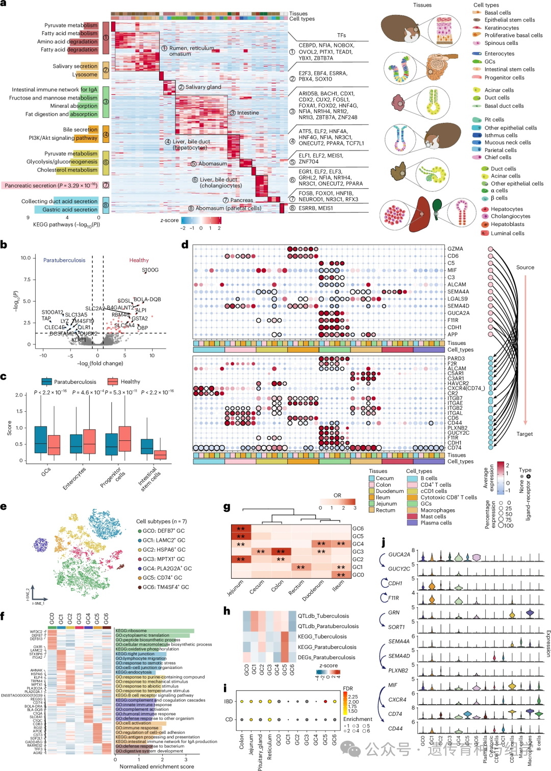 在奶牛健康与疾病研究方面,聚焦副结核病这一影响奶牛养殖业的重要疾病,发现肠道杯状细胞(GC)发挥重要作用,GC与免疫细胞间存在 APP-CD74、MIF-CD74_CXCR4 等配体-受体通路的跨肠道段共享交互作用,GC5亚型主要分布于空肠,其标记基因在结核与副结核相关的529个基因中显著富集;跨物种分析发现,人炎症性肠病(IBD)、乳糜泻(CD)的遗传力在奶牛空肠、网胃组织及GC5亚型中显著富集,为利用牛模型研究人类肠道疾病提供了理论支撑。
