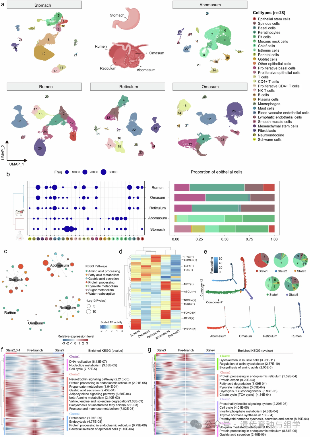同时,研究解析了奶牛4个胃的细胞异质性,发现瘤胃、网胃、瓣胃的上皮细胞中氨基酸和脂肪酸降解相关基因显著上调,与前胃在反刍动物纤维消化、能量代谢中的核心功能高度契合,瘤胃棘突细胞在短链脂肪酸吸收中发挥关键作用;并通过跨物种比较,揭示了反刍动物皱胃与人类胃上皮细胞的功能同源性,有力支持了“前胃起源于食道,皱胃起源于十二指肠”的多起源假说,皱胃中胃酸分泌和蛋白质加工相关基因被显著激活,为理解反刍动物独特消化机制及物种间消化系统演化提供了分子证据。