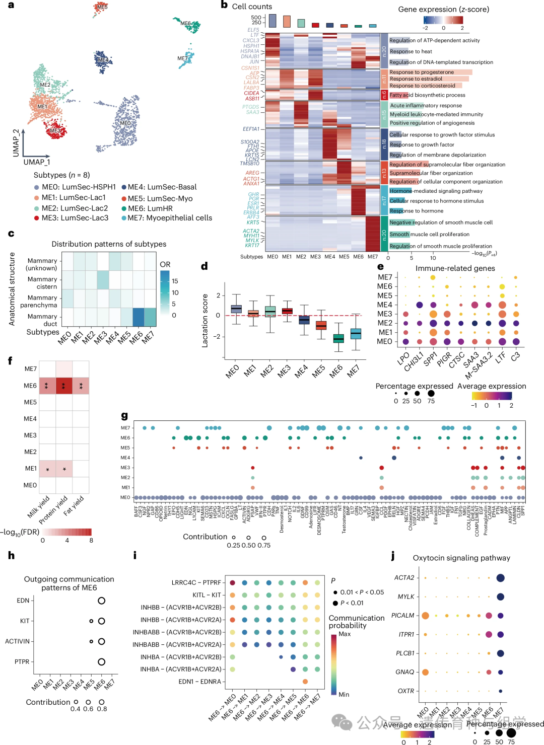 在重要性状机制解析方面,针对产奶这一核心育种目标性状,深入分析乳腺上皮细胞,发现乳腺上皮细胞分为8个亚型,其中6个腔分泌细胞亚型(ME0-5)高表达 ELF5、LTF 等标记基因,ME0-3亚型因高表达泌乳相关基因,与乳汁生物合成密切相关;腔激素响应细胞亚型(ME6)表达 ESR1、PGR、PRLR 等激素受体基因,可能通过激素信号调控乳腺泌乳功能;基底肌上皮细胞亚型(ME7)高表达 OXTR、PLCB1 等催产素信号通路基因,参与乳汁排出过程中的乳腺收缩。
