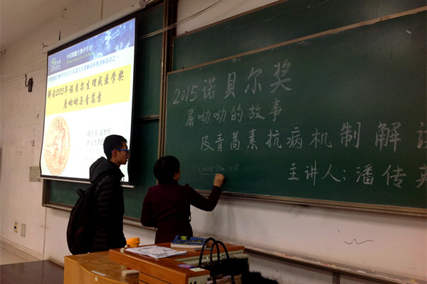 为丰富我院本科新生的科学文化知识,提升科学素养,弘扬科学知识,传播科学思想。11月27日,曾文先教授团队骨干成员、硕士研究生导师潘传英副教授在北校区8T02阶梯教室为我院240余名2015级本科生做了一场题为“解读2015年诺贝尔生理医学奖:屠呦呦与青蒿素”的精彩讲座。此次讲座系中国细胞生物学学会“2015年诺贝尔奖解读科普系列讲座”,学院本科生、研究生200余人参加了本次讲座。